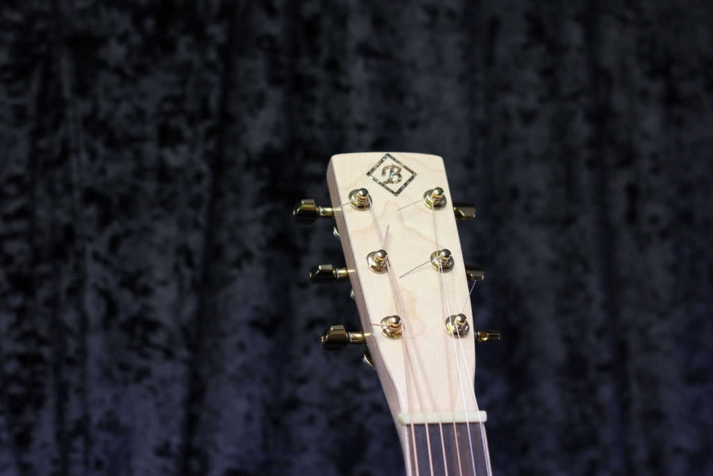 The fret wire consists of Medium/Medium Gold wire with Abalone dot inlays on the fingerboard, and an Abalone inlayed "B" logo on the Maple Headstock.